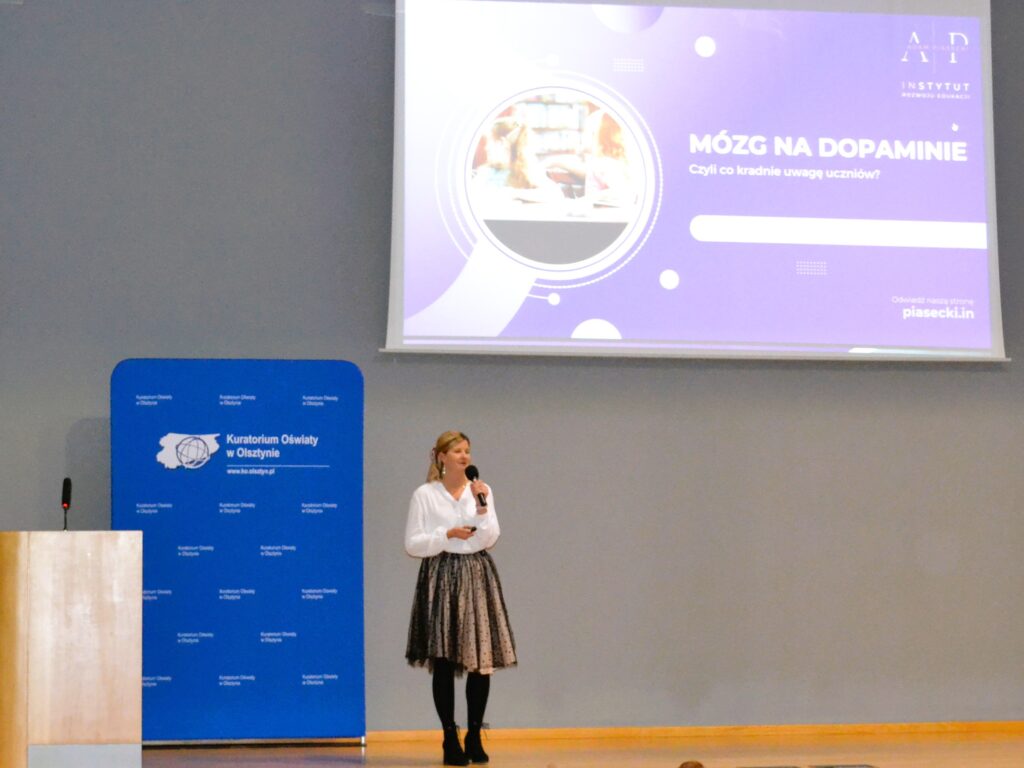 Uczestnicy konferencji mieli również możliwość wysłuchania wykładu Adama Piaseckiego – założyciela i dyrektora akredytowanego Niepublicznego Ośrodka Doskonalenia Nauczycieli Instytutu Rozwoju Edukacji pt. „Skuteczna komunikacja w zespole placówek oświatowych”. Prelegent omówił proces komunikacji, wskazując na znaczenie jasnego przekazu, aktywnego słuchania oraz budowania atmosfery zaufania. Szczególną uwagę poświęcił zagadnieniom związanym z negocjacjami i rozwiązywaniem konfliktów, podkreślając, że umiejętność prowadzenia dialogu i poszukiwania kompromisu stanowi fundament efektywnej współpracy. W dalszej części konferencji wystąpiła Anna Tomiczek – psycholog dziecięcy, która wygłosiła wykład pt. „Mózg na dopaminie. Czyli co kradnie uwagę uczniów?”. W swoim wystąpieniu skoncentrowała się na roli dopaminy w procesach uczenia się i zapamiętywania, wskazując, że neuroprzekaźnik ten ma kluczowe znaczenie dla motywacji i utrwalania wiedzy. Omówiła również współczesne wyzwania związane z funkcjonowaniem dzieci i młodzieży w świecie pełnym bodźców, zwracając uwagę na wpływ nowych technologii i mediów społecznościowych na zdolność koncentracji uczniów.