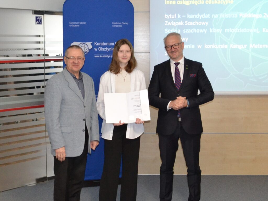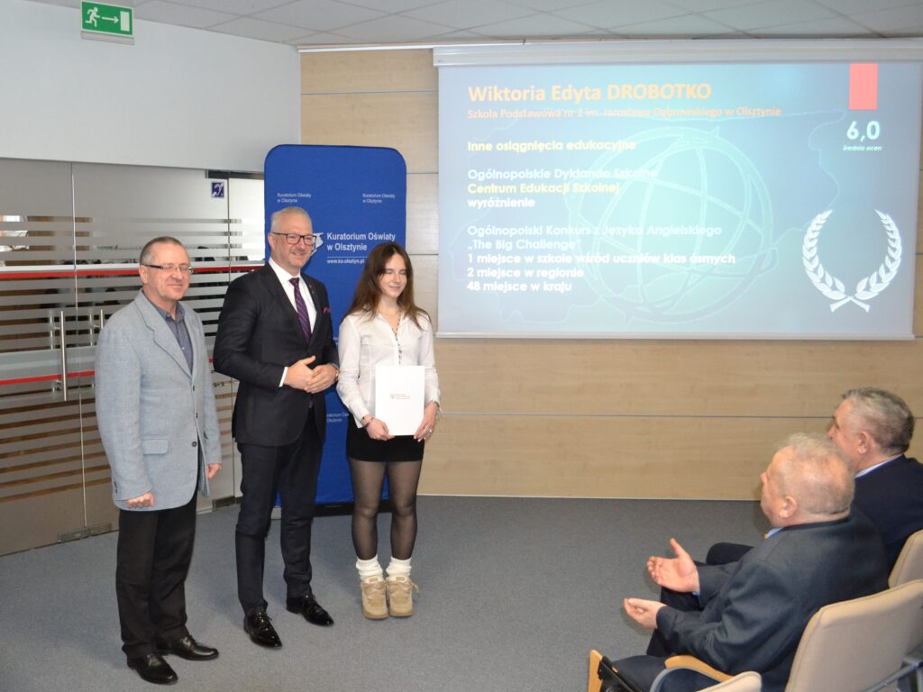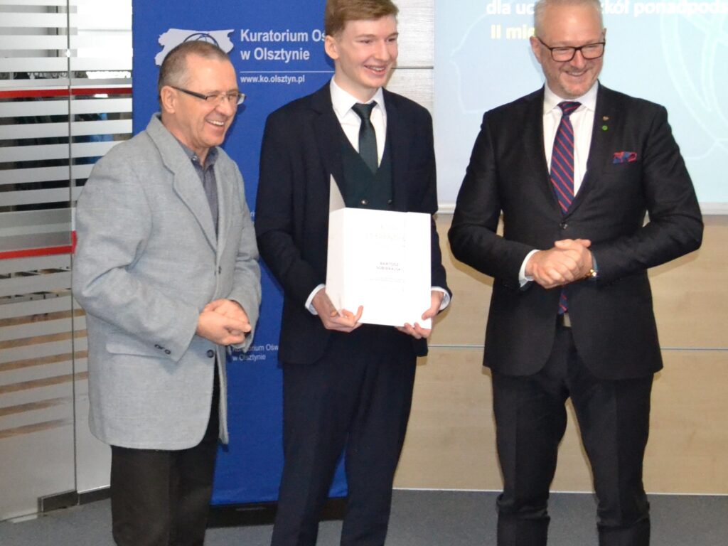 Dyplomy stypendystom wręczyli Pan Radosław Król – Wojewoda Warmińsko-Mazurski oraz Pan Adam Sławomir Szkolnik – Warmińsko-Mazurski Wicekurator Oświaty. W uroczystości uczestniczyli również: Pan Zbigniew Szczypiński – Wicewojewoda Warmińsko-Mazurski, Pan Edward Pietrulewicz – Pełnomocnik Wojewody ds. Oświaty i Edukacji oraz Pani Magdalena Stankiewicz – Dyrektor Wydziału Nadzoru Pedagogicznego Kuratorium Oświaty w Olsztynie.