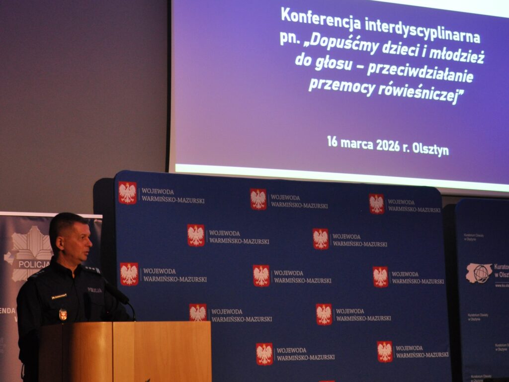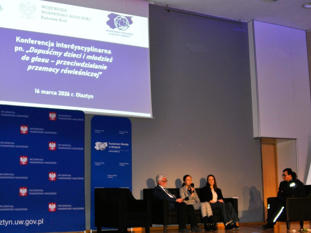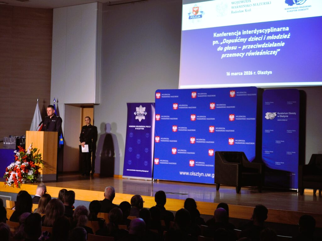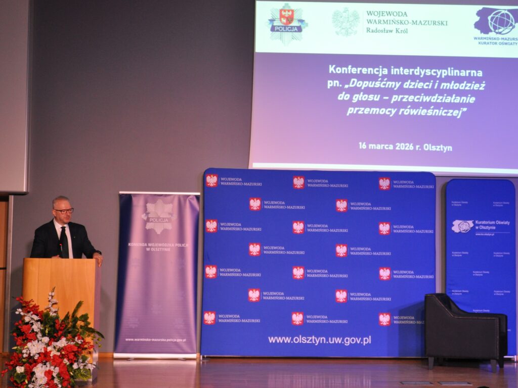 W dniu 16 marca 2026 r. w Warmińsko-Mazurskim Urzędzie Wojewódzkim w Olsztynie odbyła się konferencja interdyscyplinarna „Dopuśćmy dzieci i młodzież do głosu – przeciwdziałanie przemocy rówieśniczej”. Organizatorami konferencji byli: Komendant Wojewódzki Policji w Olsztynie, Wojewoda Warmińsko-Mazurski oraz Warmińsko-Mazurski Kurator Oświaty.